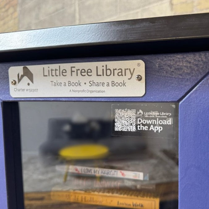 This window cling encourages visitors to download the Little Free Library mobile app. Through the app visitors: